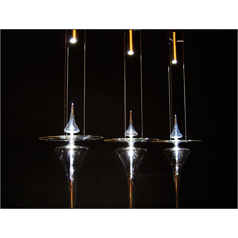 L'ombre du corps de lampe en aluminium atténue la lumière directe verticale à travers le verre. La distance entre la source de lumière et le verre est réglable pour modifier l'éclairage.