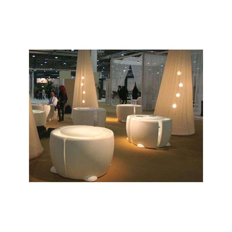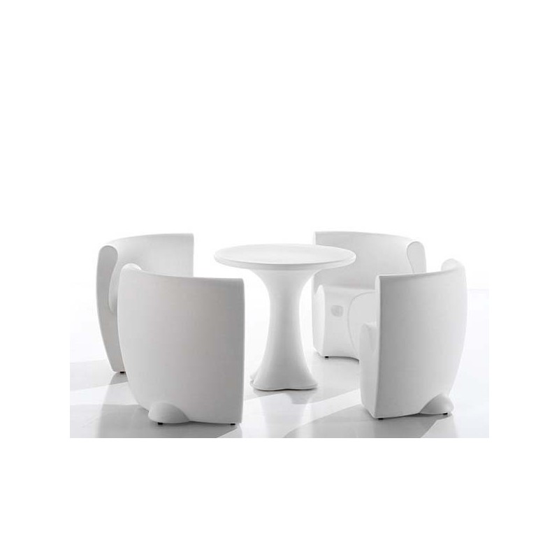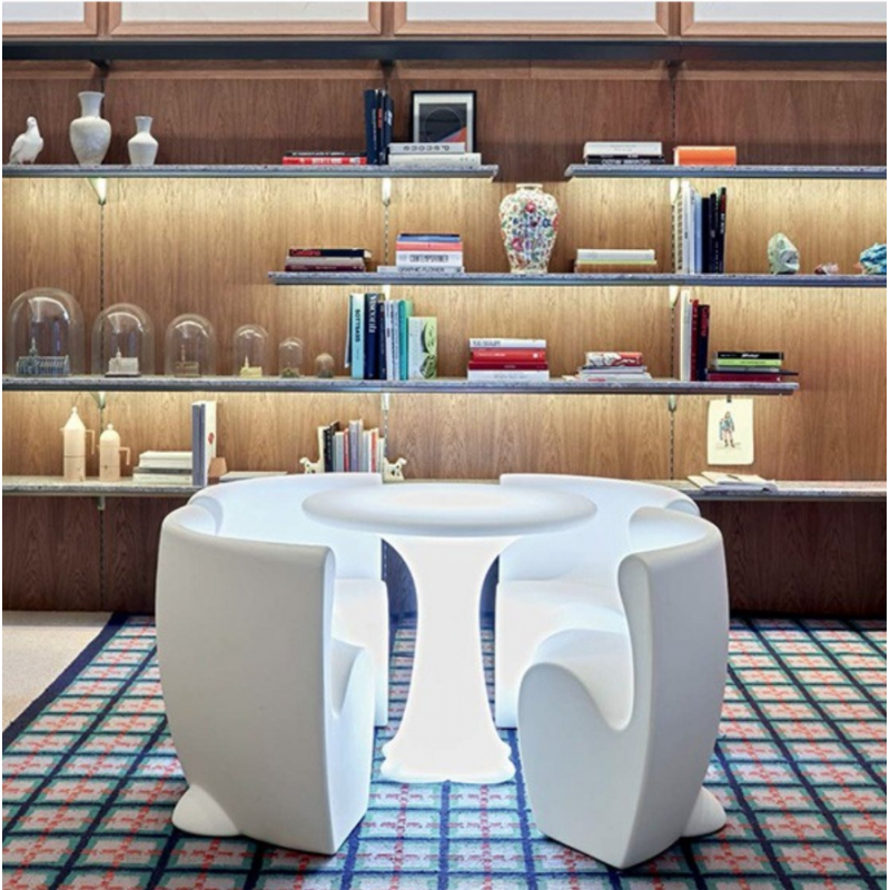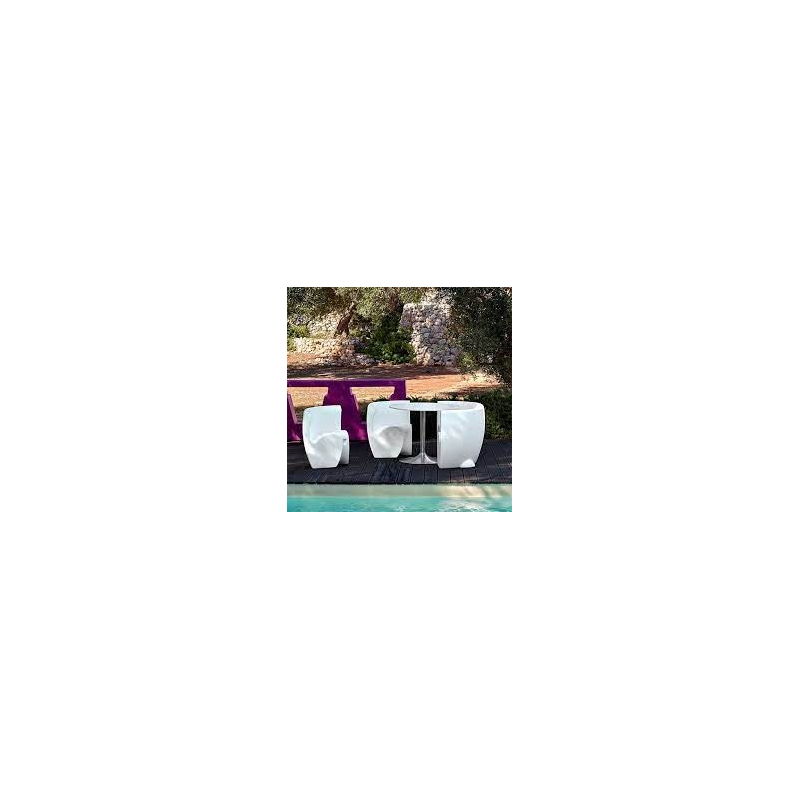 L'ensemble Community 4 se compose d'une table Design Teddy inerte ou lumineuse (version lumineuse à Led RGBW sur batterie rechargeable) et de ses 4 chaises Design Rhonda (non lumineuses)