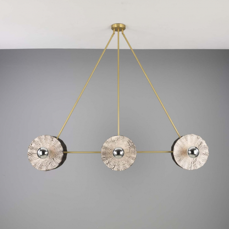 Inspiré par la texture naturelle et la symétrie épurée, le lustre Eclipse Kapok introduit une présence artisanale dans les intérieurs spacieux. Sa forme, maîtrisée et réfléchie, conjugue la céramique brute à la chaleur du laiton brossé.