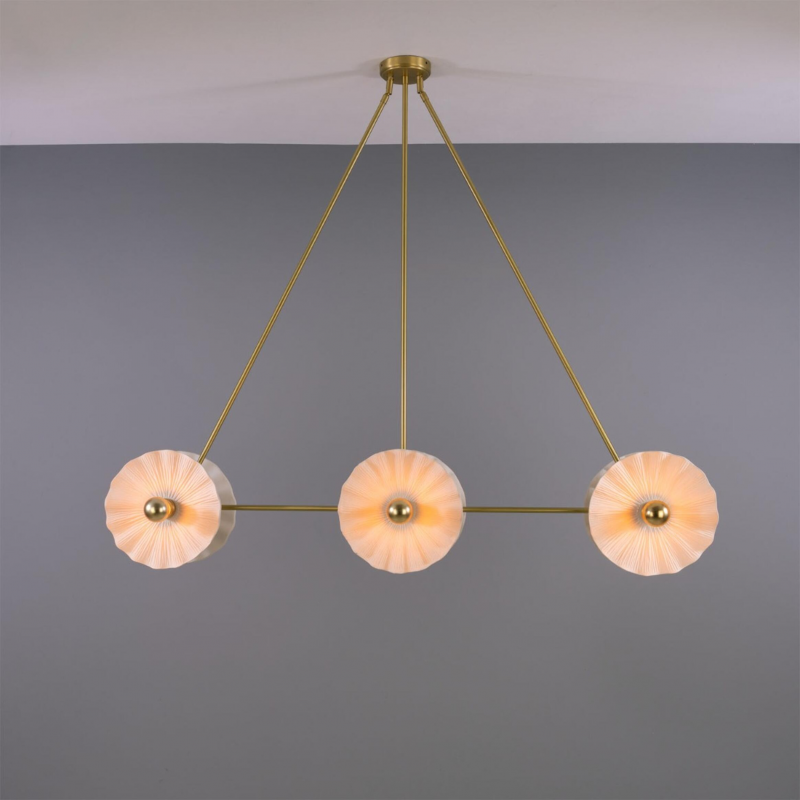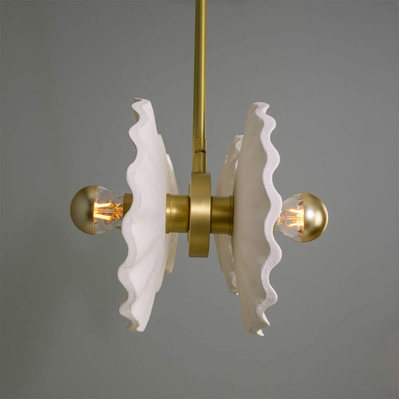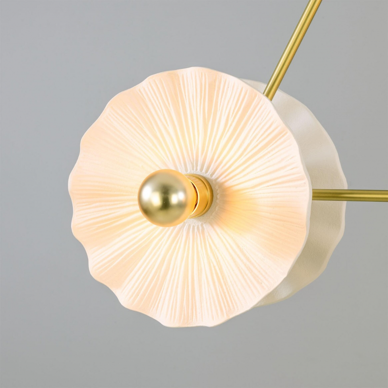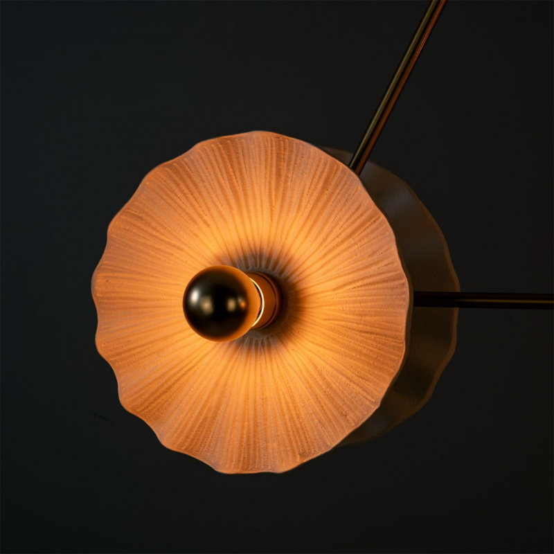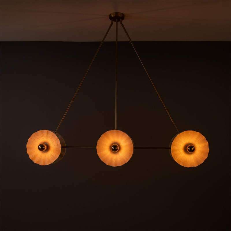 Le lustre Eclipse Kapok associe des abat-jour en céramique à une structure architecturale raffinée. Ses six sources lumineuses sont réparties sur trois bras sculpturaux, chacun supportant une paire d’abat-jour striés et aux bords festonnés.
