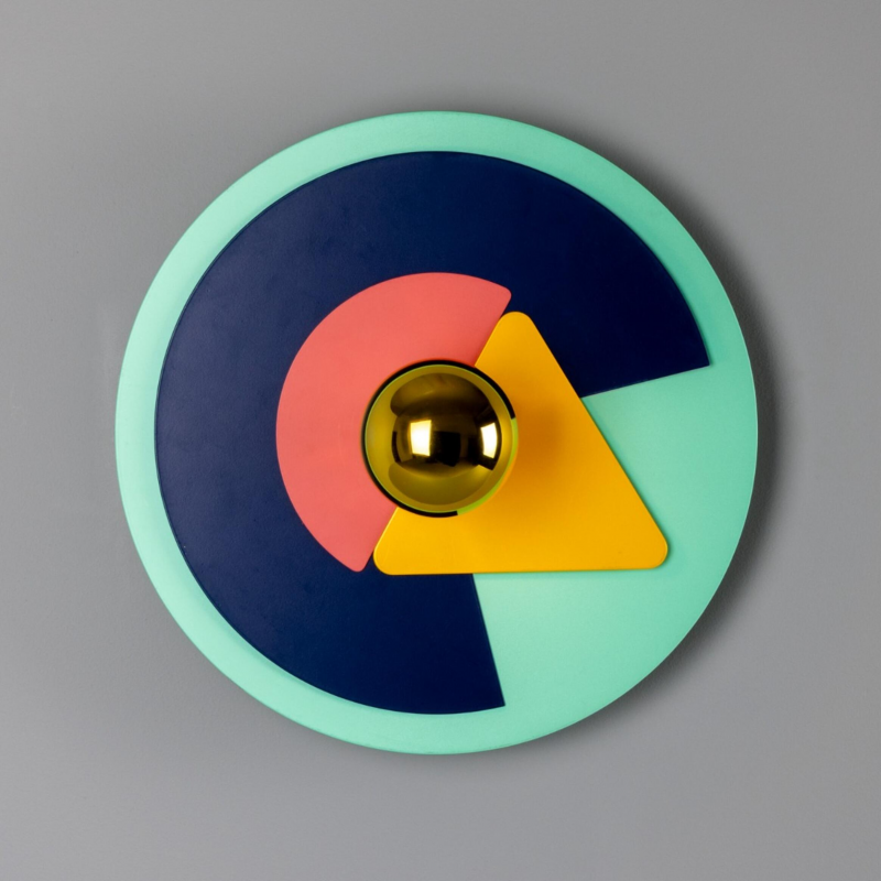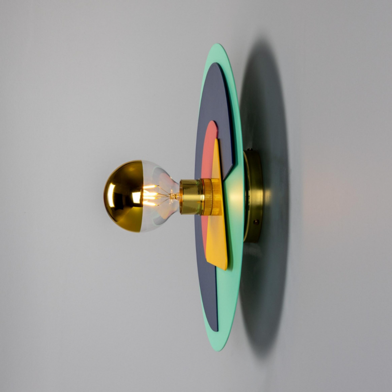 Une applique murale graphique aux couleurs superposées et aux détails en laiton poli, conçue pour apporter une structure ludique à des intérieurs soigneusement pensés.